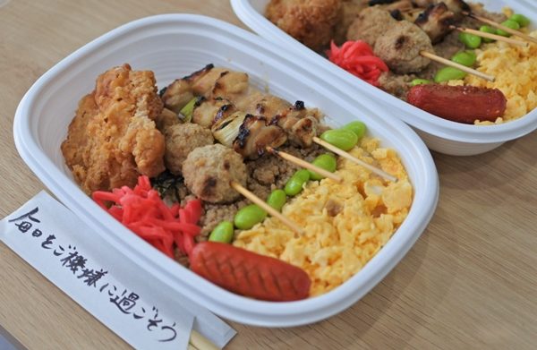 三種類の串に、そぼろや、たまごが乗ってて、ウィンナーと、そして唐揚げ~\(^o^)/